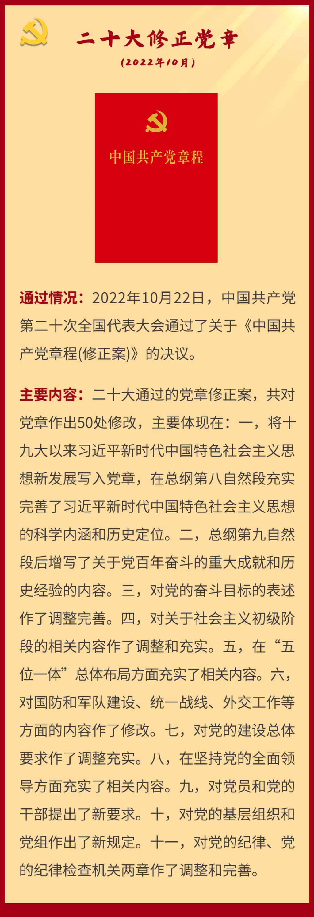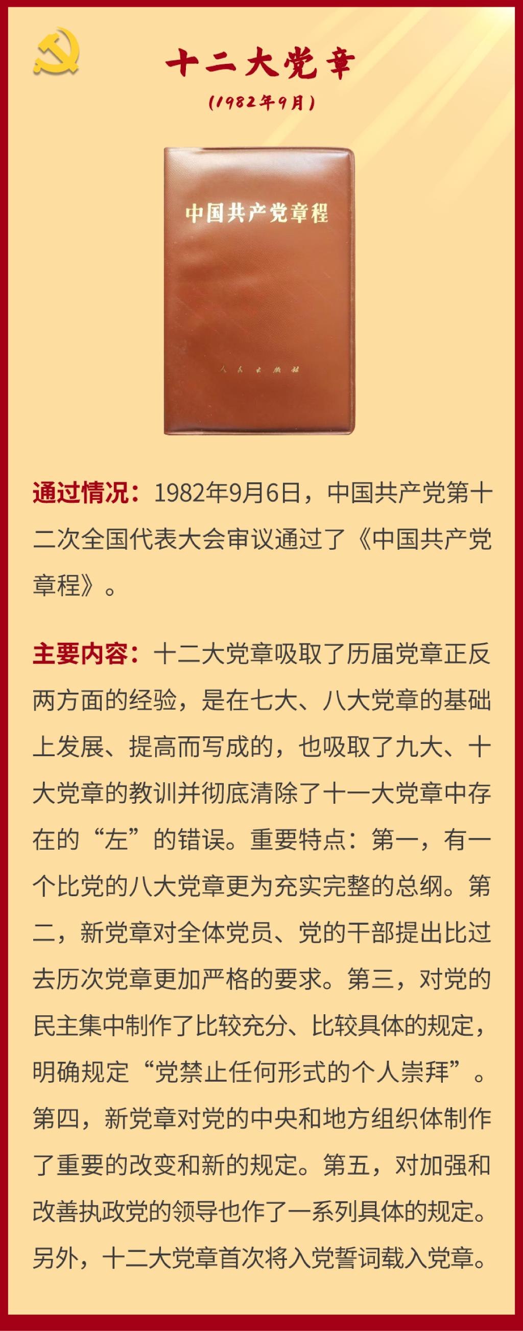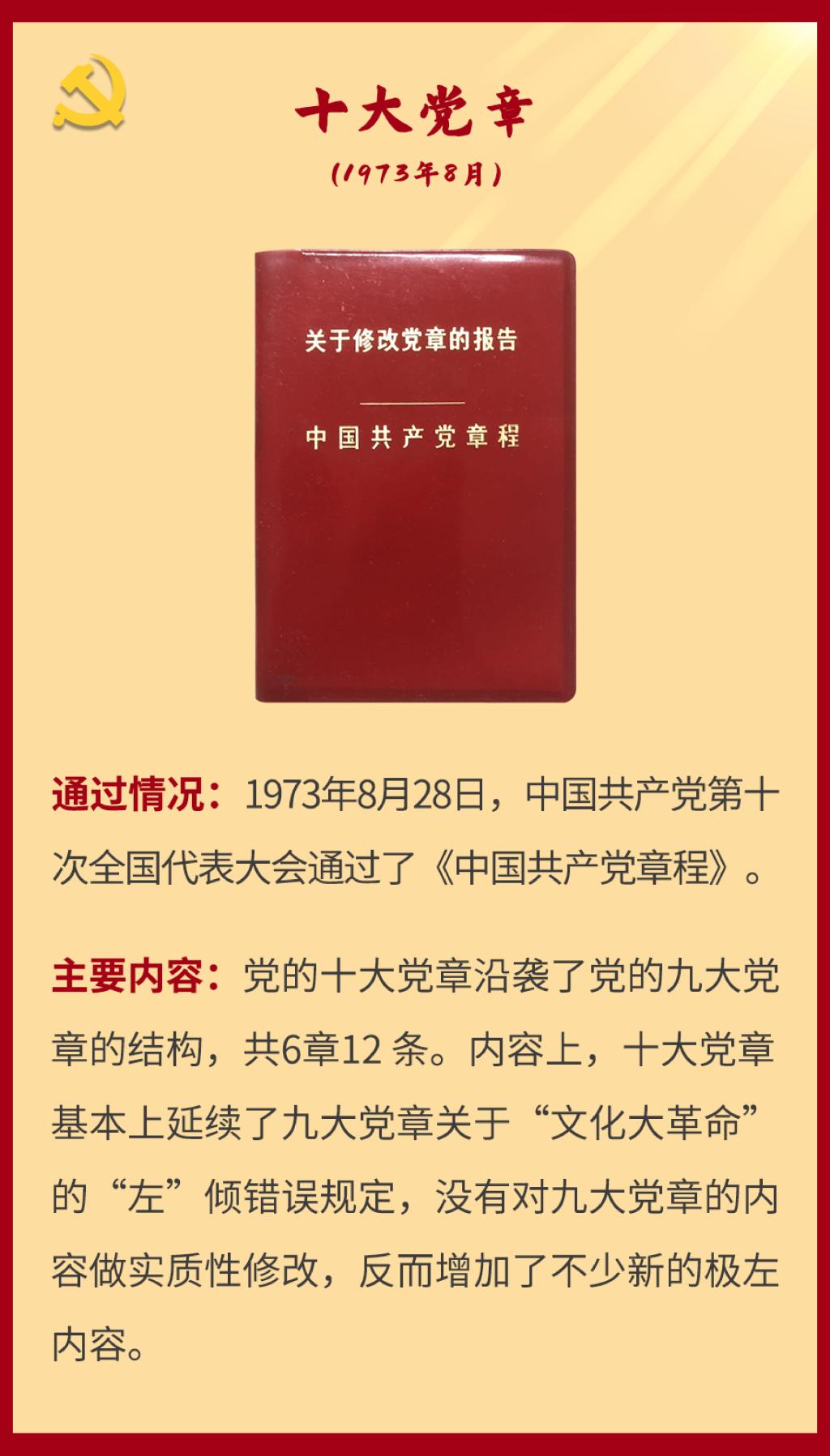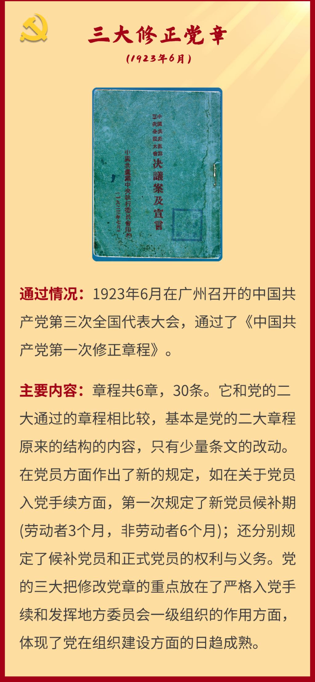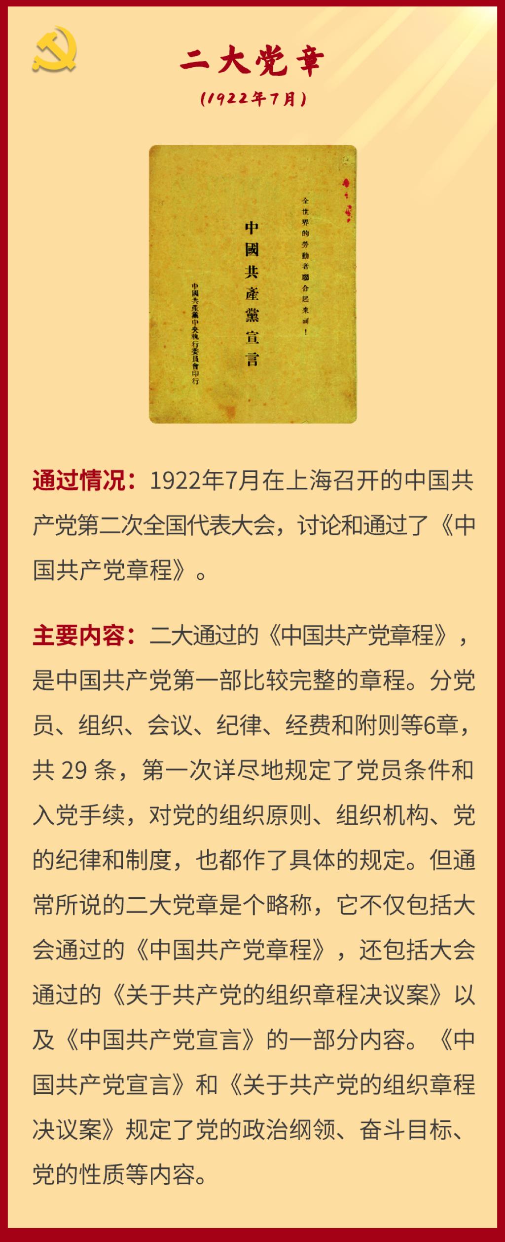 党章是党的总章程。党的全国代表大会根据理论创新和实践创新的需要对党章进行修改,是我们党的一个惯例。党的二十大根据新形势新任务对党章进行了适当修改,于2022年10月22日通过了关于《中国共产党章程(修正案)》的决议。党建网依据相关材料整理了从党的一大到二十大党章历次制定与修正的“极简史”,邀您一起学习了解。
