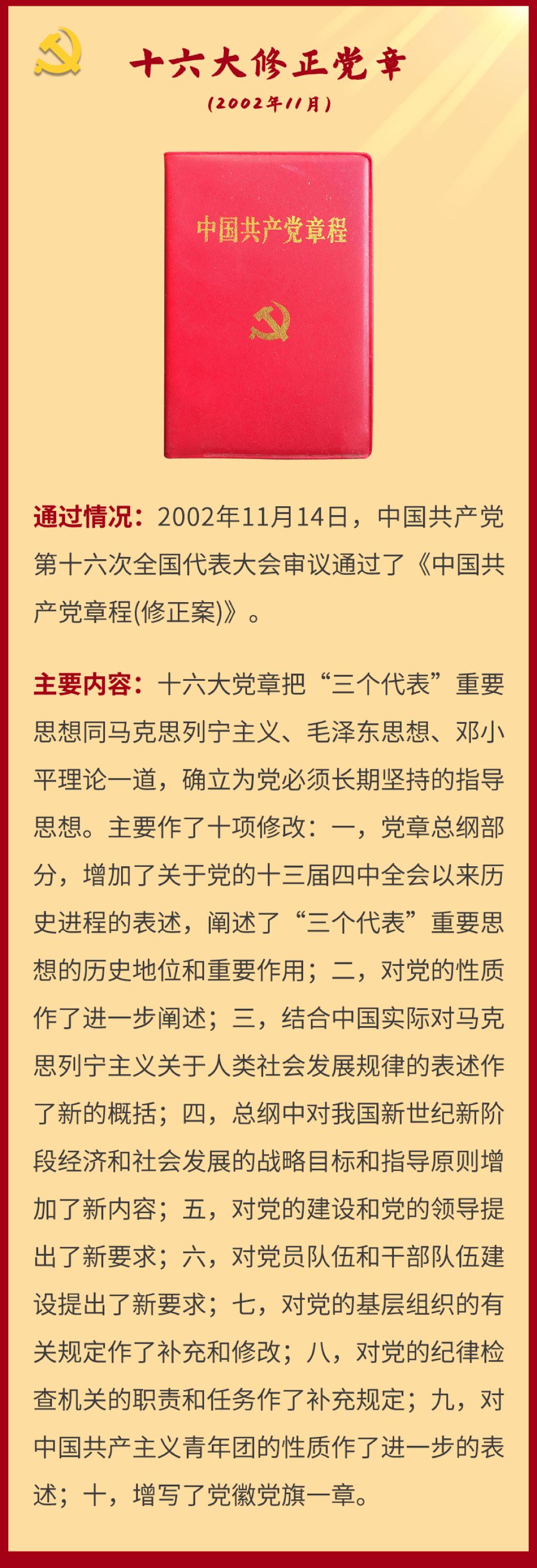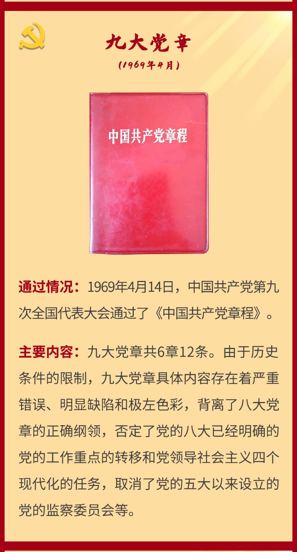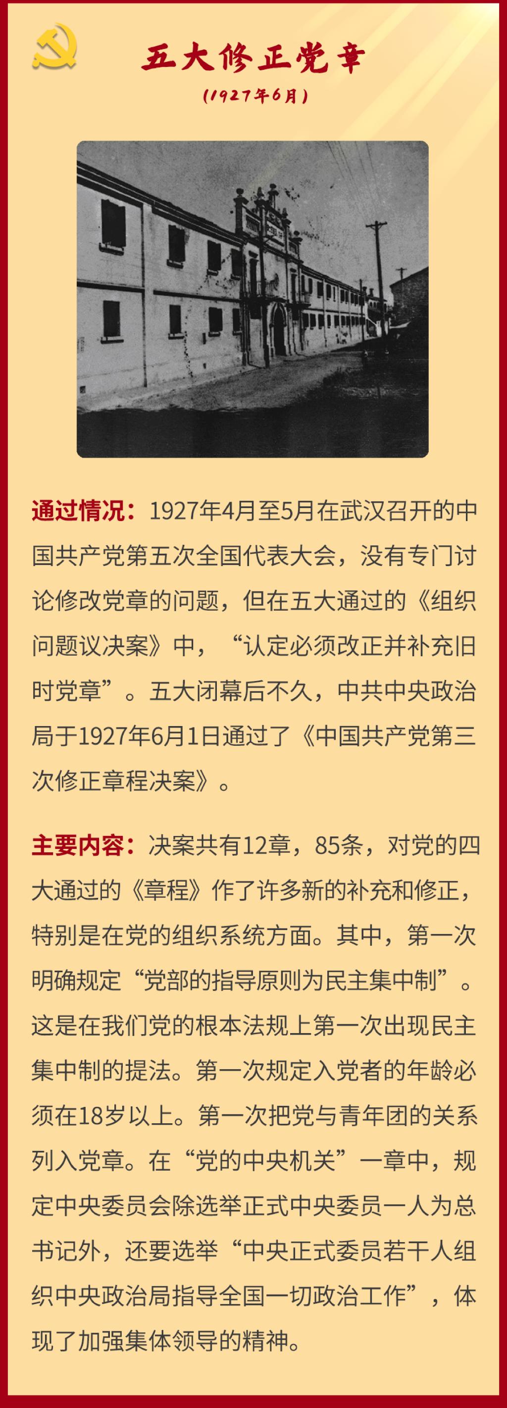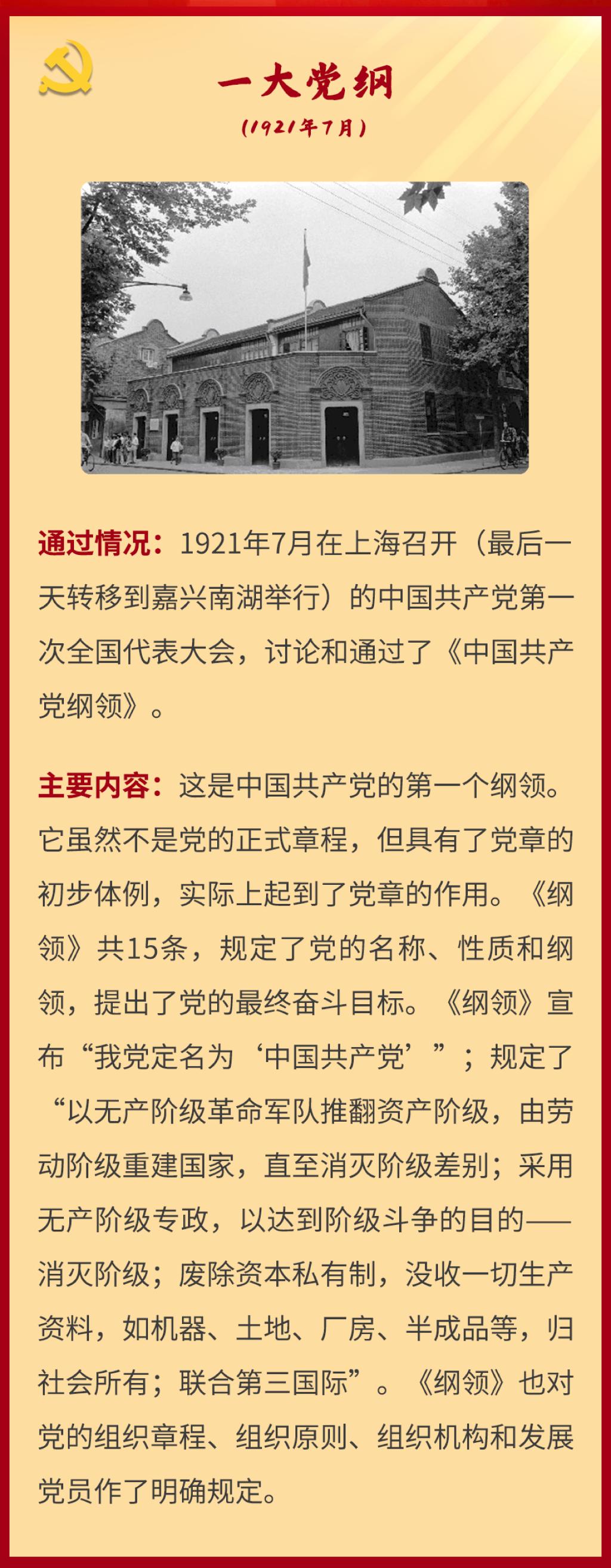 党章是党的总章程。党的全国代表大会根据理论创新和实践创新的需要对党章进行修改,是我们党的一个惯例。党的二十大根据新形势新任务对党章进行了适当修改,于2022年10月22日通过了关于《中国共产党章程(修正案)》的决议。党建网依据相关材料整理了从党的一大到二十大党章历次制定与修正的“极简史”,邀您一起学习了解。