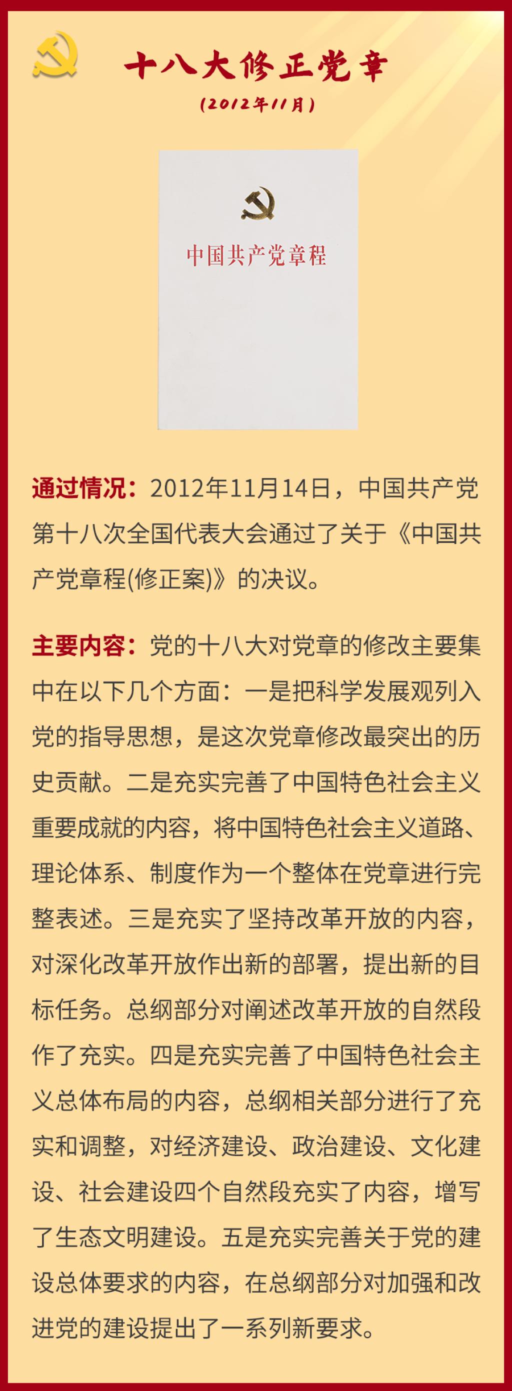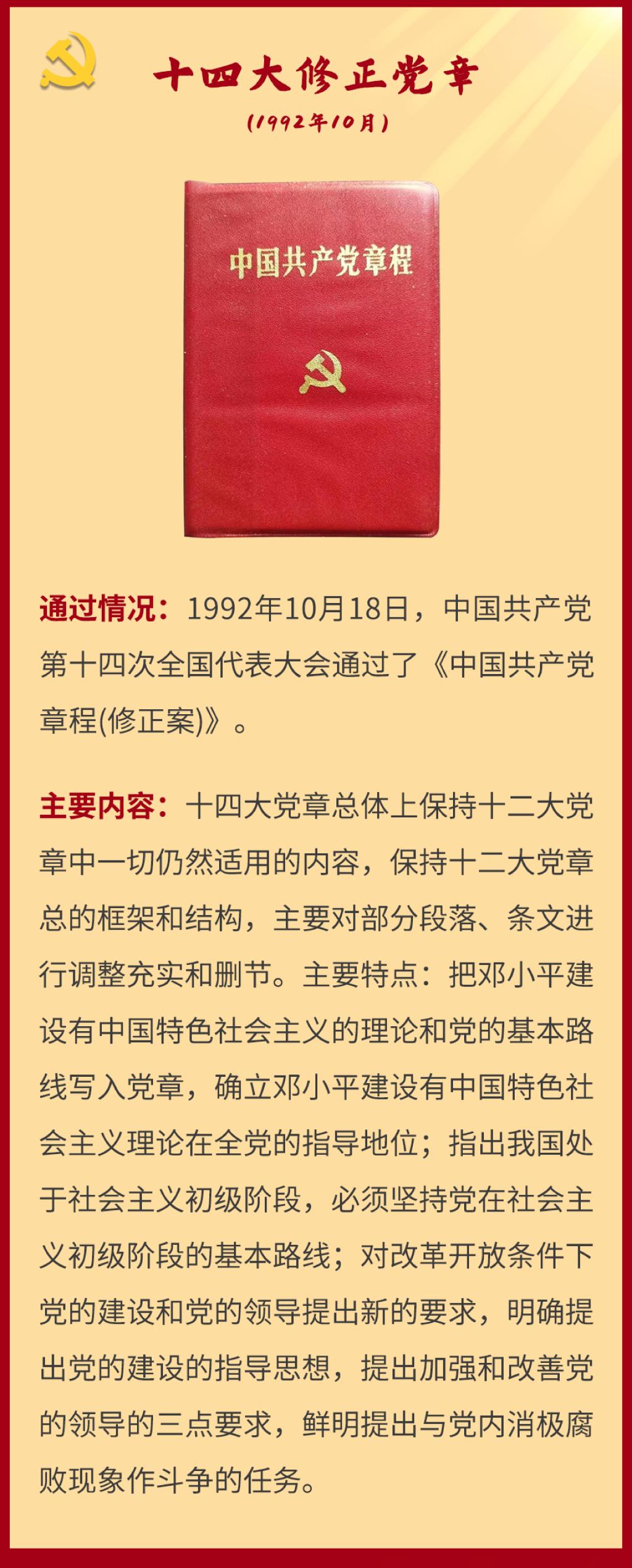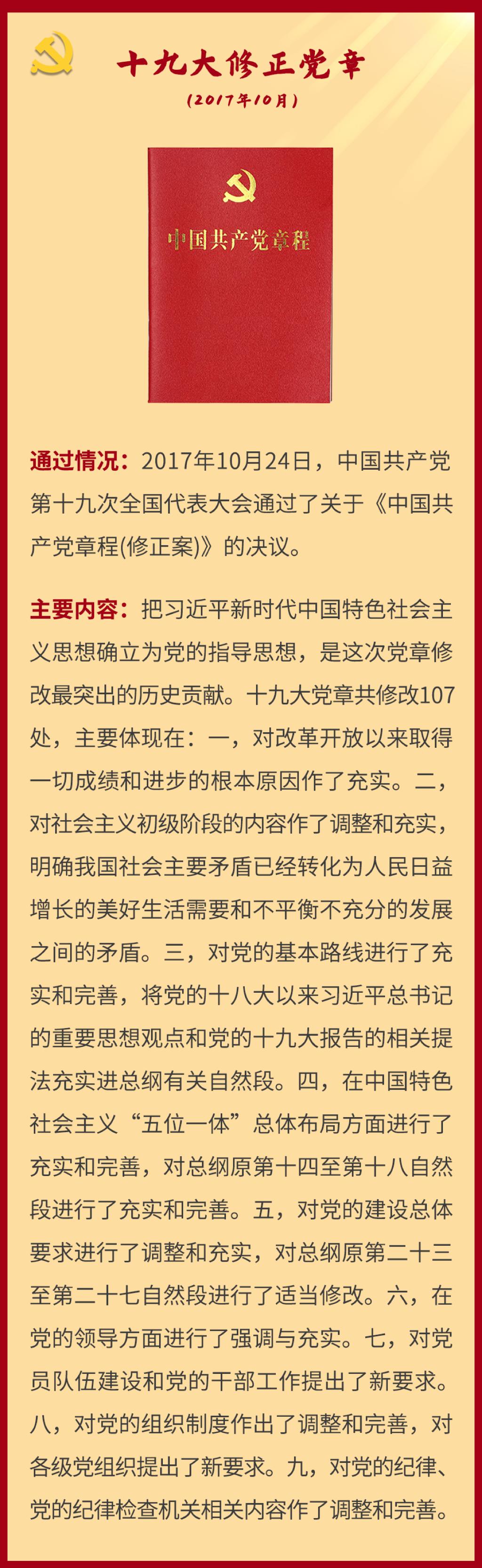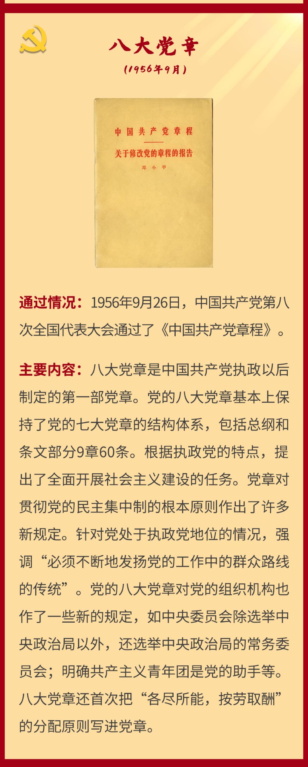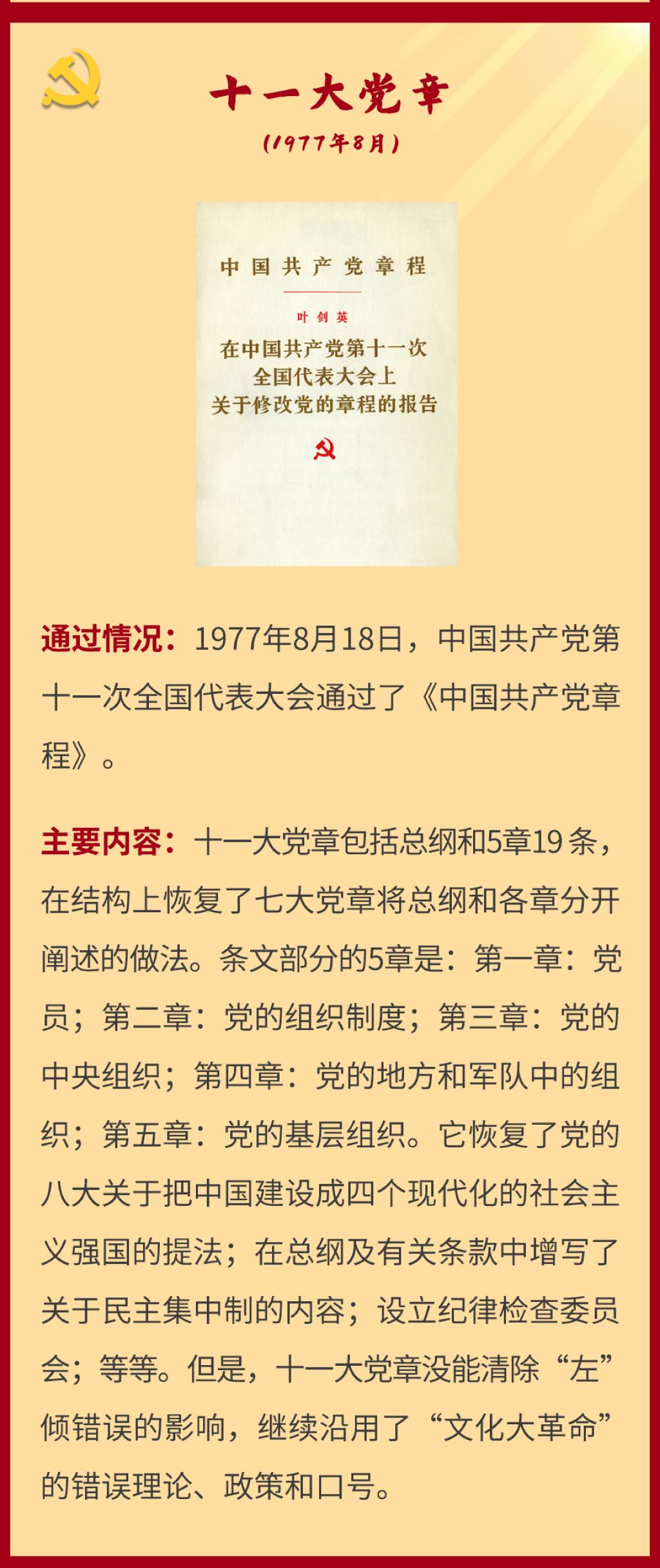 党章是党的总章程。党的全国代表大会根据理论创新和实践创新的需要对党章进行修改,是我们党的一个惯例。党的二十大根据新形势新任务对党章进行了适当修改,于2022年10月22日通过了关于《中国共产党章程(修正案)》的决议。党建网依据相关材料整理了从党的一大到二十大党章历次制定与修正的“极简史”,邀您一起学习了解。