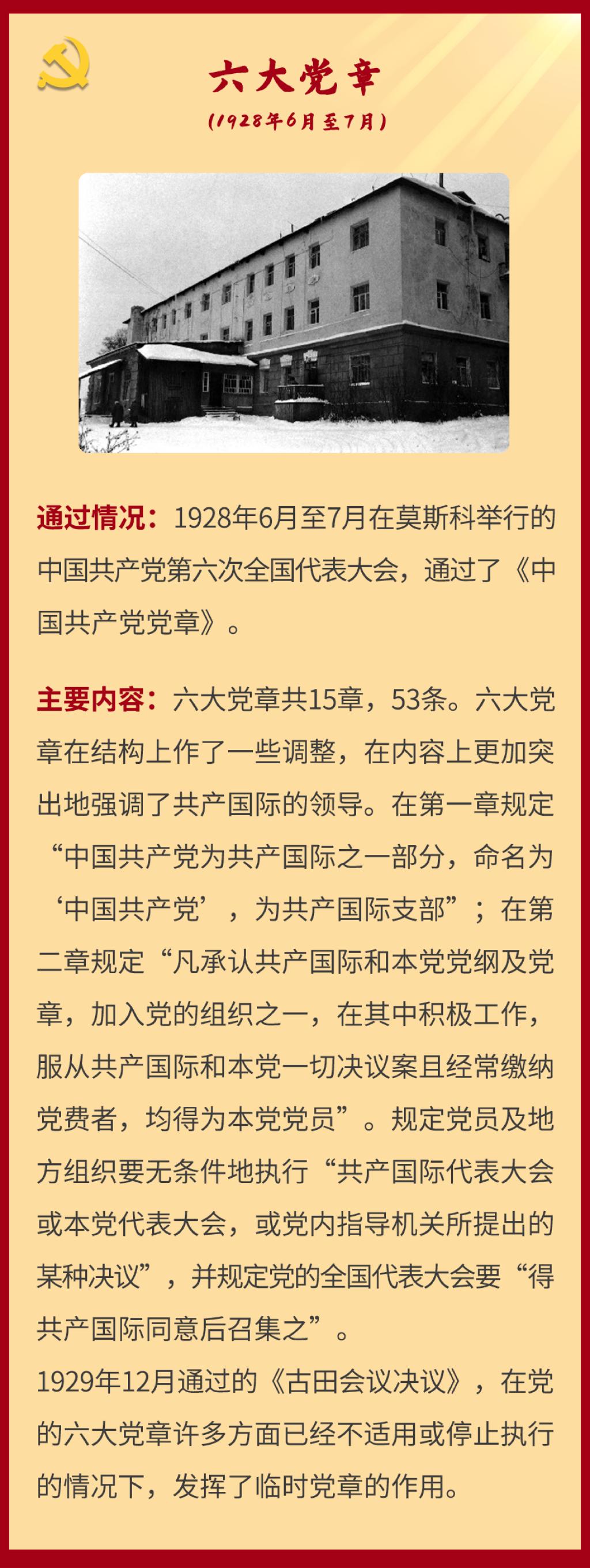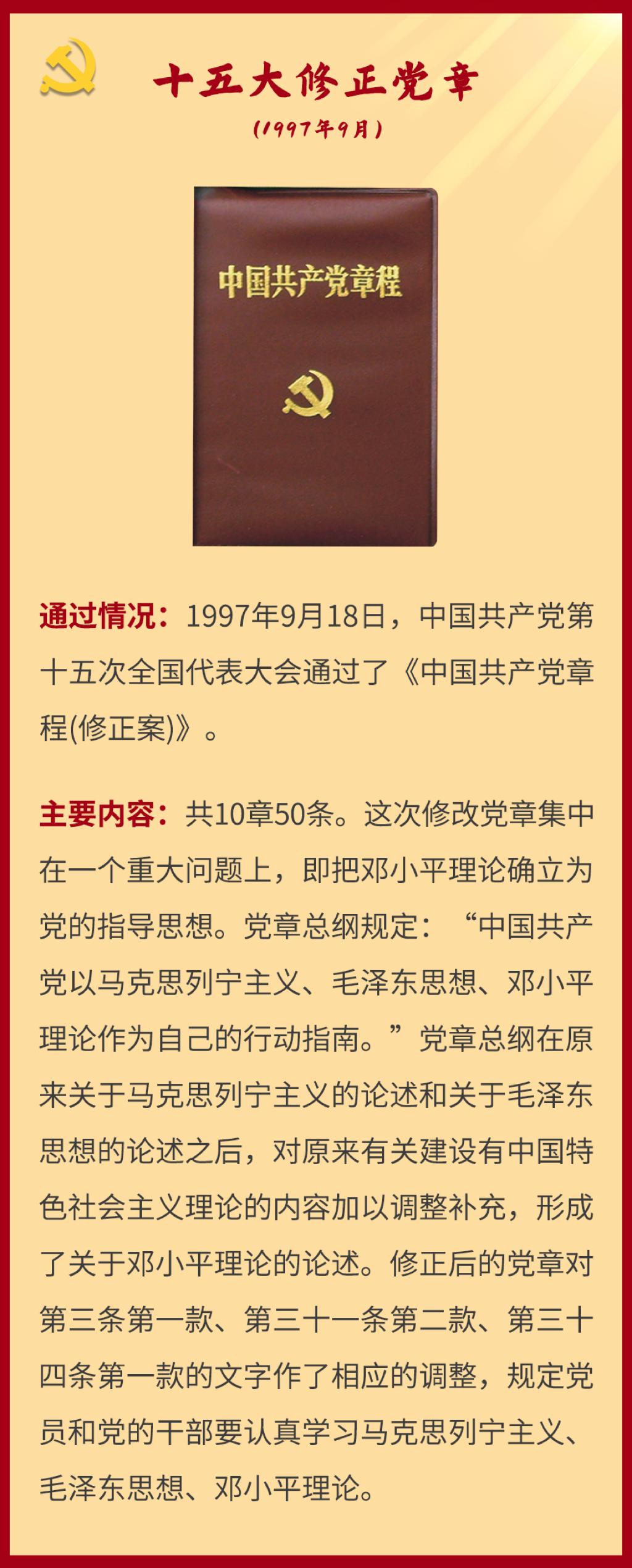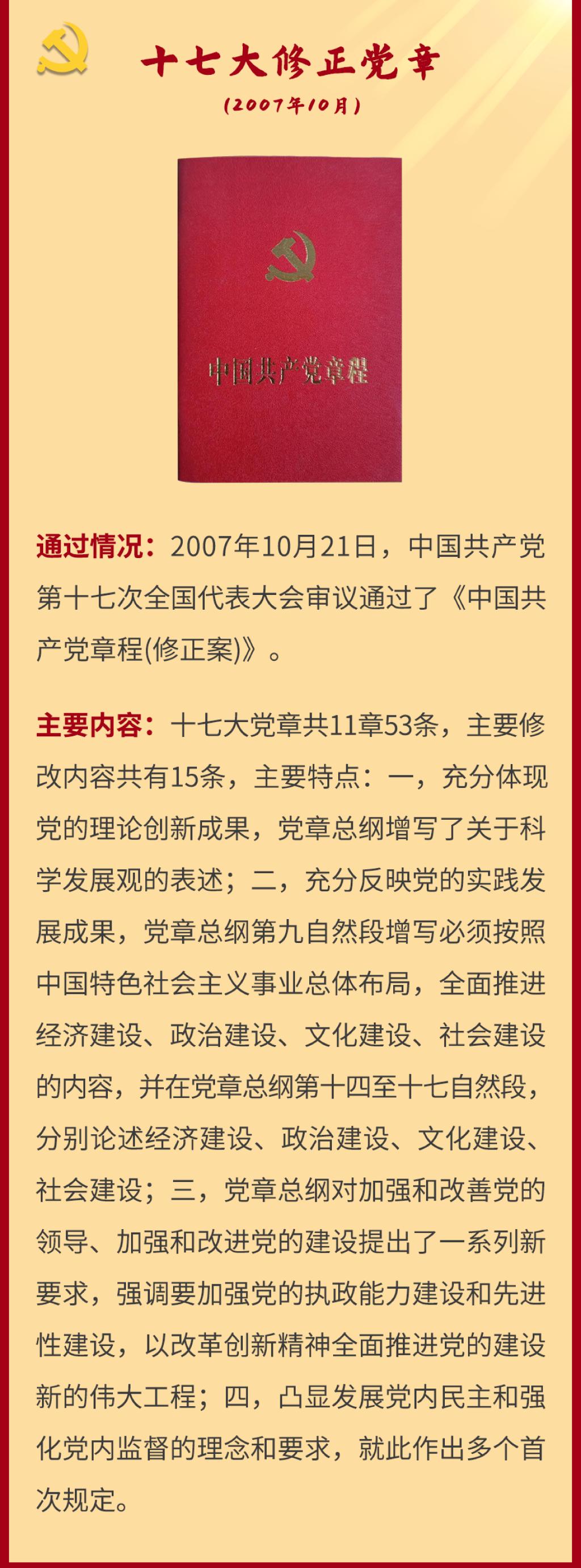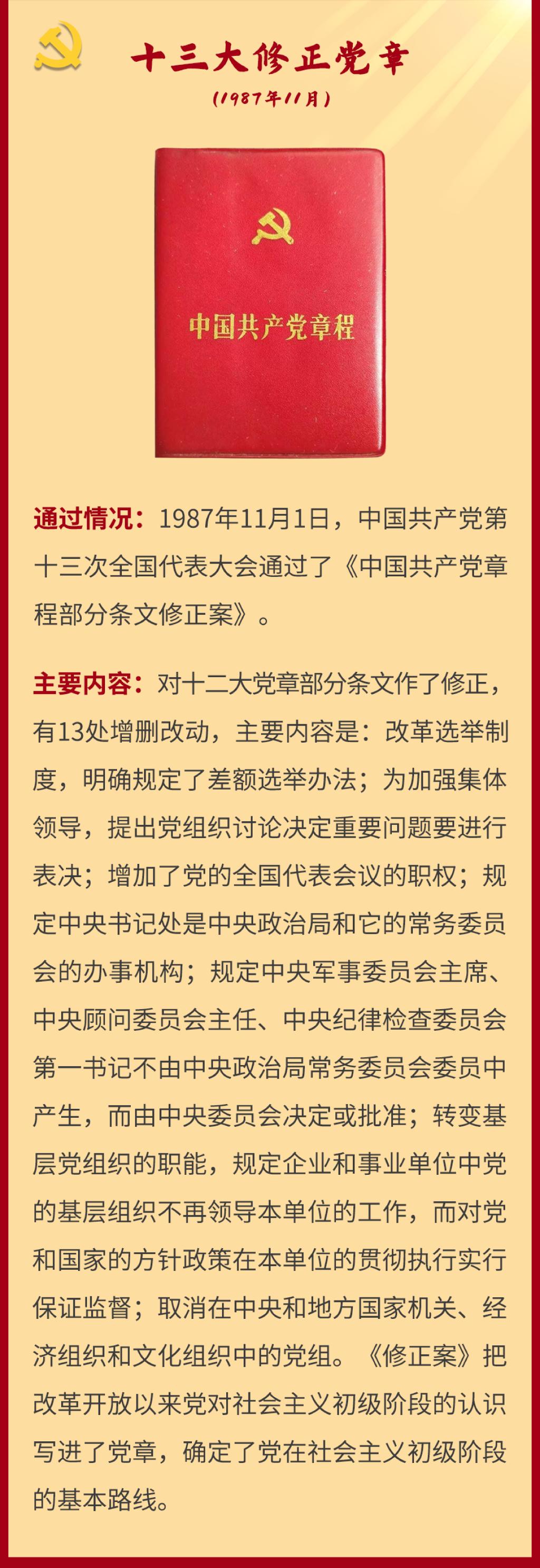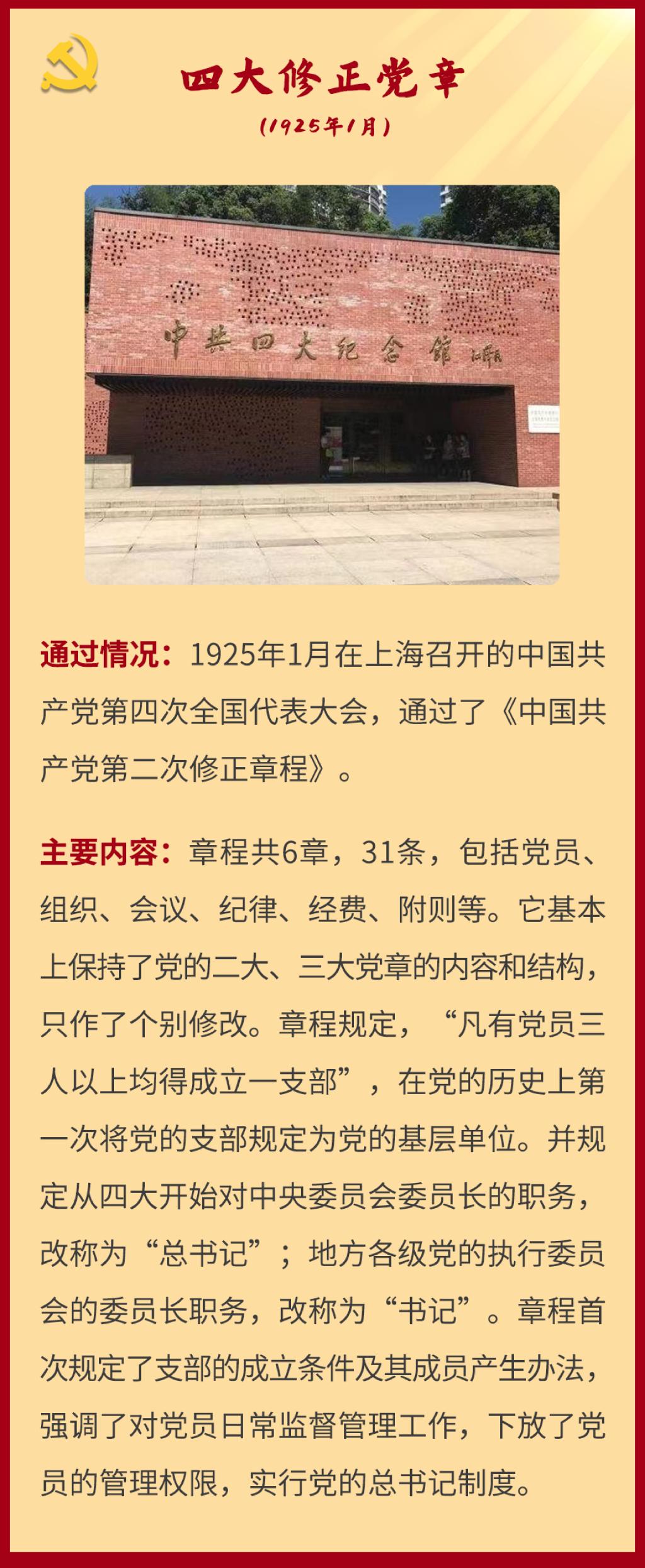 党章是党的总章程。党的全国代表大会根据理论创新和实践创新的需要对党章进行修改,是我们党的一个惯例。党的二十大根据新形势新任务对党章进行了适当修改,于2022年10月22日通过了关于《中国共产党章程(修正案)》的决议。党建网依据相关材料整理了从党的一大到二十大党章历次制定与修正的“极简史”,邀您一起学习了解。