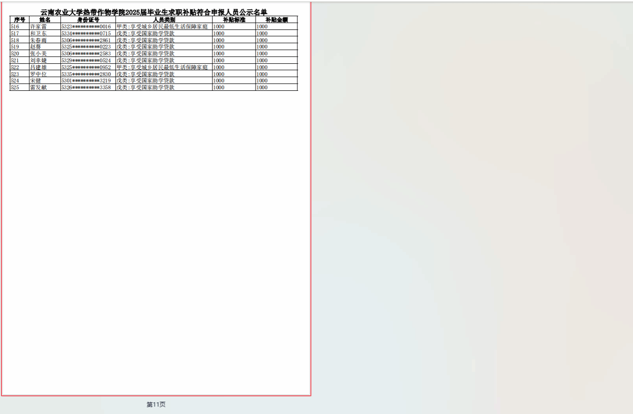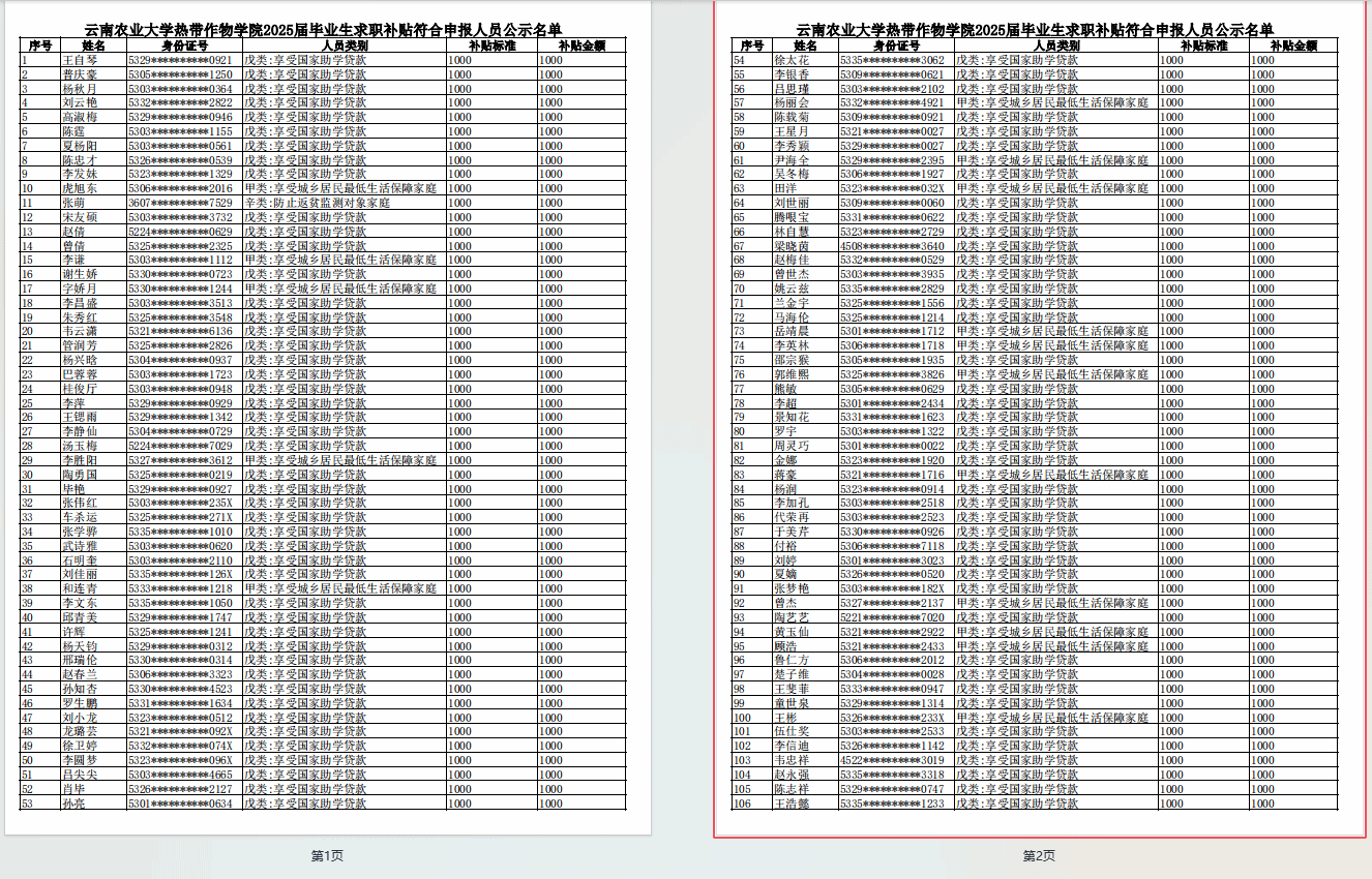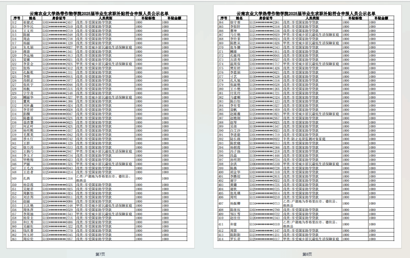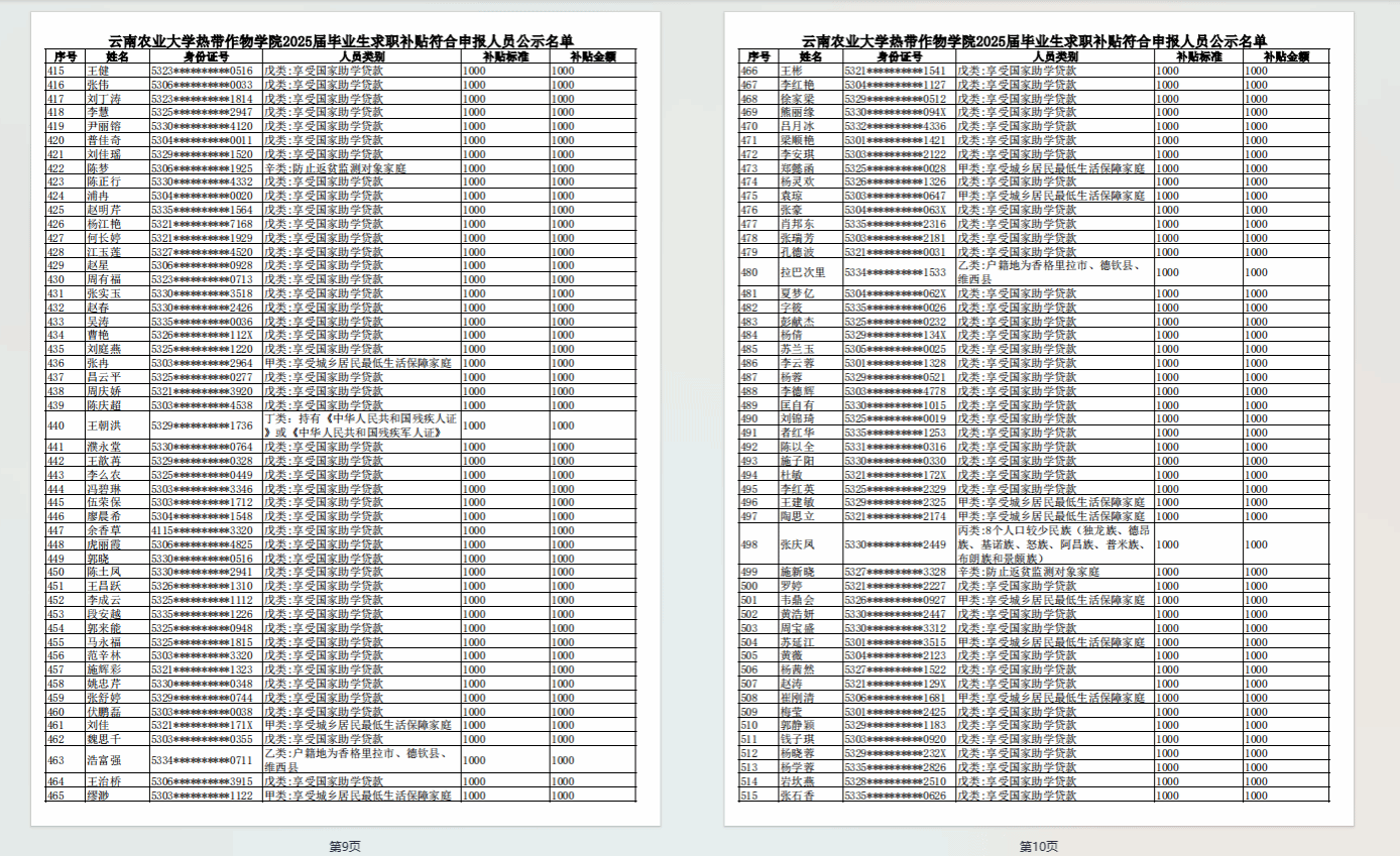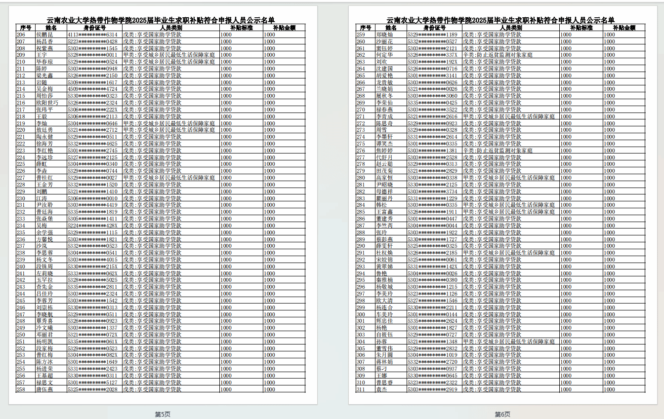 根据财政部人力资源社会保障部关于印 发〈就业补助资金管理办法〉的通知》(财社〔2023〕181 号)、 《云南省人力资源和社会保障厅  云南省教育厅  云南省财政 厅  云南省公安厅  云南省民政厅  云南省农业农村厅  云南 省残疾人联合会关于做好高校毕业生一次性求职补贴发放工作 的通知》(云人社通〔2024〕17号)文件要求,学院认真贯彻落实高校毕业生求职创业补贴申请专项工作,现将2025届毕业生求职补贴符合人员申报公示名单公示如下(见附件),公示期自即日起五个工作日,公式无误后报普洱市公共就业和人才服务中心审核批准。凡对以上结果存在异议,请以实名制书面形式向学生科反应,联系电话0879-3028687。