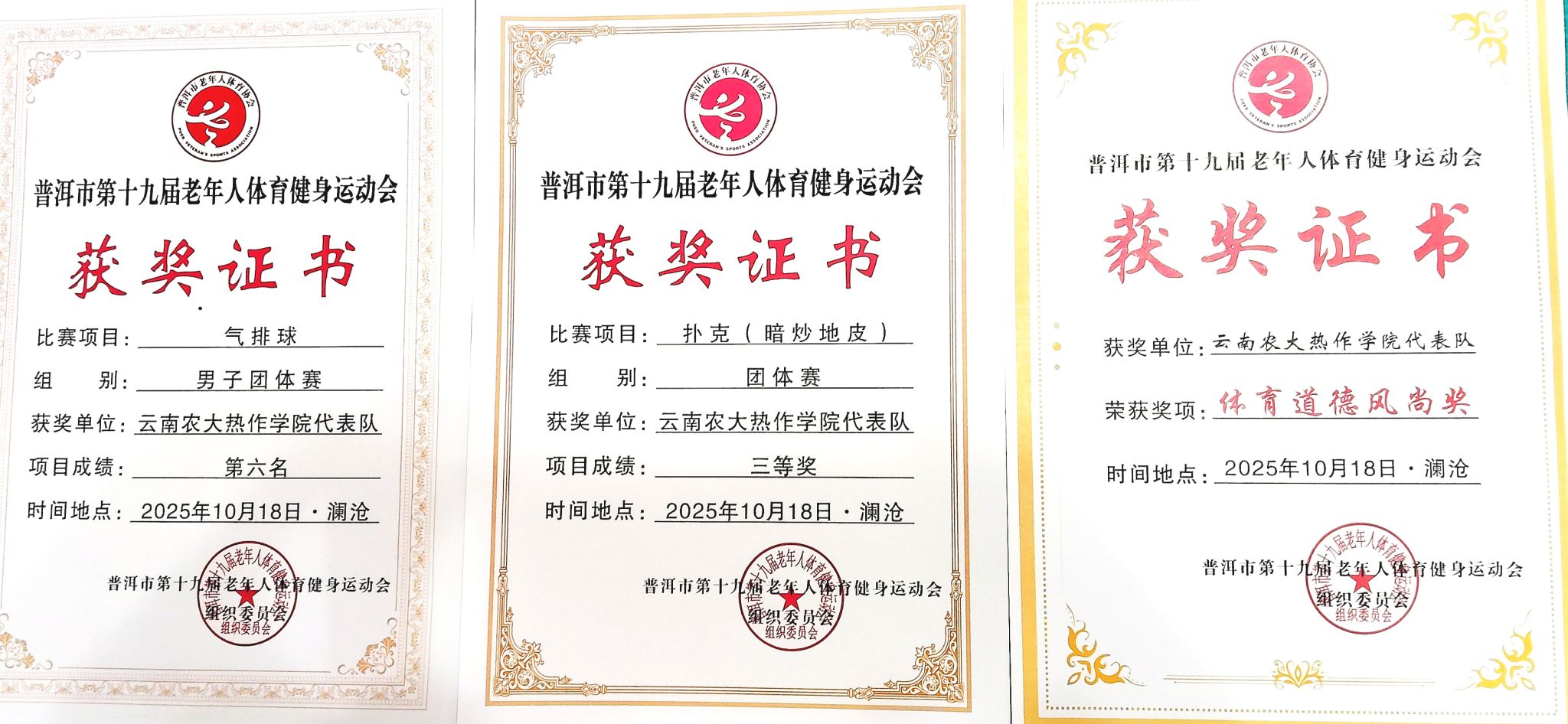 学院老年人体育协会本着“重在参与、重在健康、重在快乐、重在学习”的宗旨,派出17名队员参加了男女气排球和扑克(暗炒地皮)两个项目的竞赛。全体队员发扬团结拼搏精神,全力以赴,安全顺利地完成全部比赛项目。学院老年人体育协会代表队荣获“体育道德风尚奖”、男子组气排球第六名和扑克(暗炒地皮)比赛三等奖。