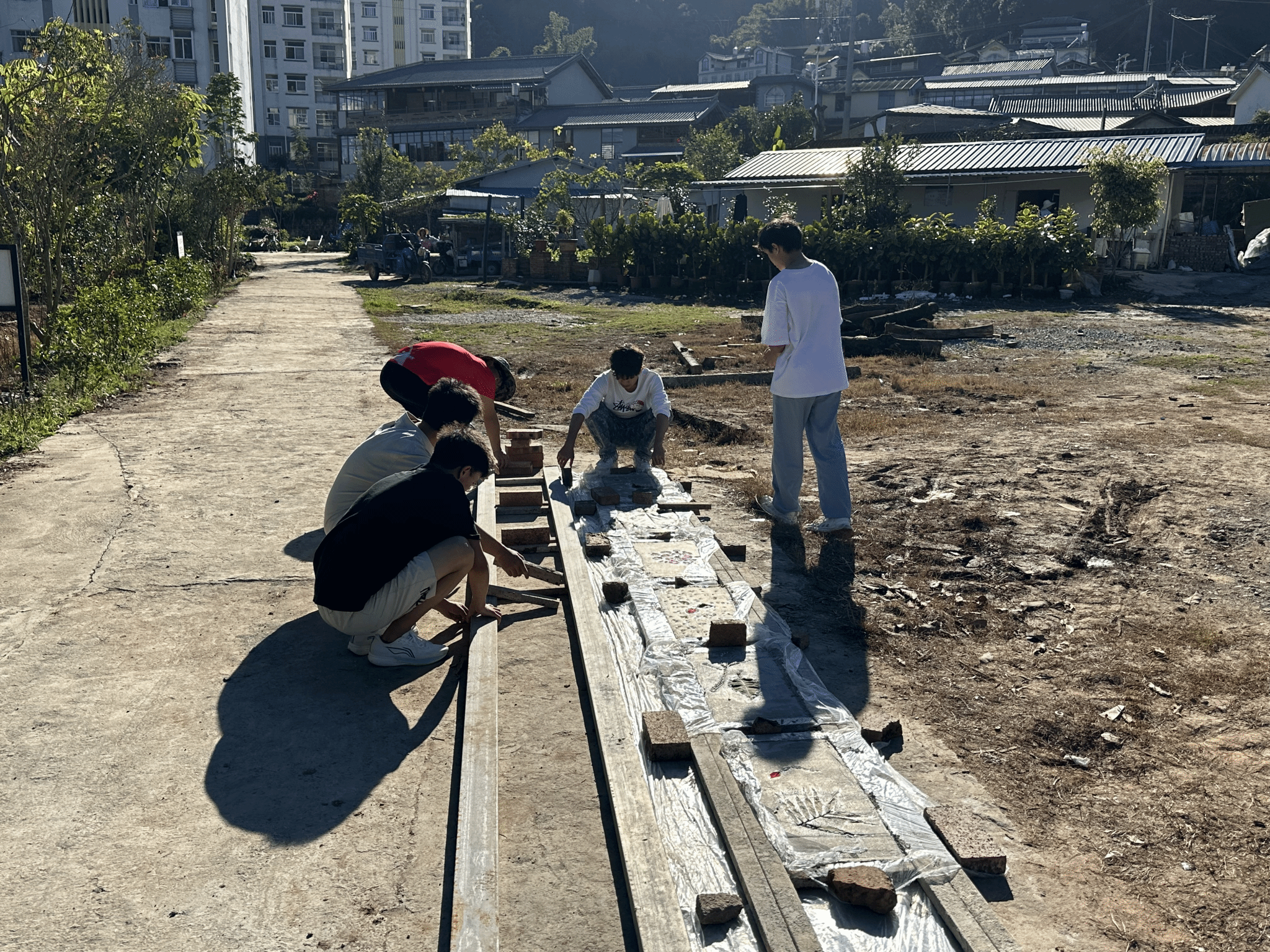 为了进一步加深风景园林专业学生对风景园林专业相关核心能力的掌握,深入践行学校培育高素质应用型人才核心导向,力促学生内化课堂所学,躬行实践、知行合一。我系风景园林专业教师程双红、王永林、依燕叫带领23级学生在校园内开展为期9周工程训练实训。该实训将风景园林工程、园林制图、园林规划设计实训和园林栽培养护实训等多学科有机融合。实训期间,老师和学生一起整地放线、挖地基、拌水泥砂浆、运水泥、铺石板、移植绿化、后期维护等,完整地体验了风景园林专业在实际岗位工作的每一个流程。