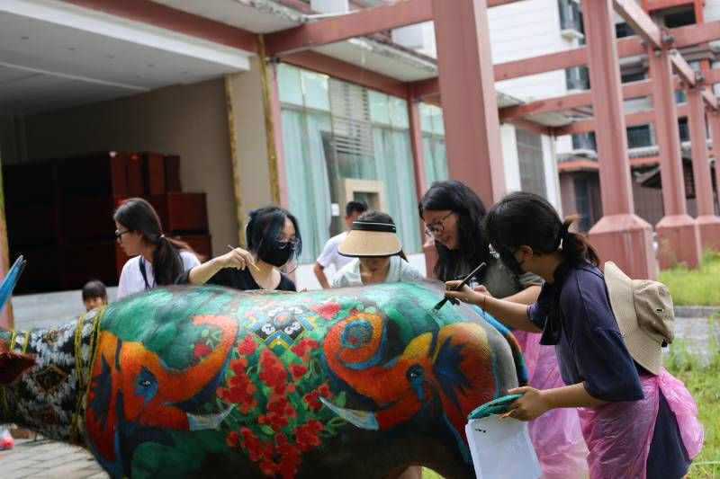 2024年5月18日,江城县第六届牛体彩绘大赛圆满落幕,该大赛是一项独具民族特色的隆重赛事,来自各地的优秀艺术家用画笔在牛体上绘制出艳丽图样,使牛体与艺术呈现完美结合。园林与建筑工程系两名教师和4名同学(风景园林)积极参与了比赛,旨在传承和弘扬传统牛体彩绘艺术,同时鼓励师生发挥创新精神,将现代审美与传统技艺相结合。大赛现场,师生们充分发挥自己的创意和才华,用画笔在牛体上绘制出了色彩斑斓、栩栩如生的图案,最终完成了以《美美与共,铸梦三江》为主题的彩绘作品,展现了师生们的艺术功底,更体现了他们对传统文化与艺术的热爱和尊重。